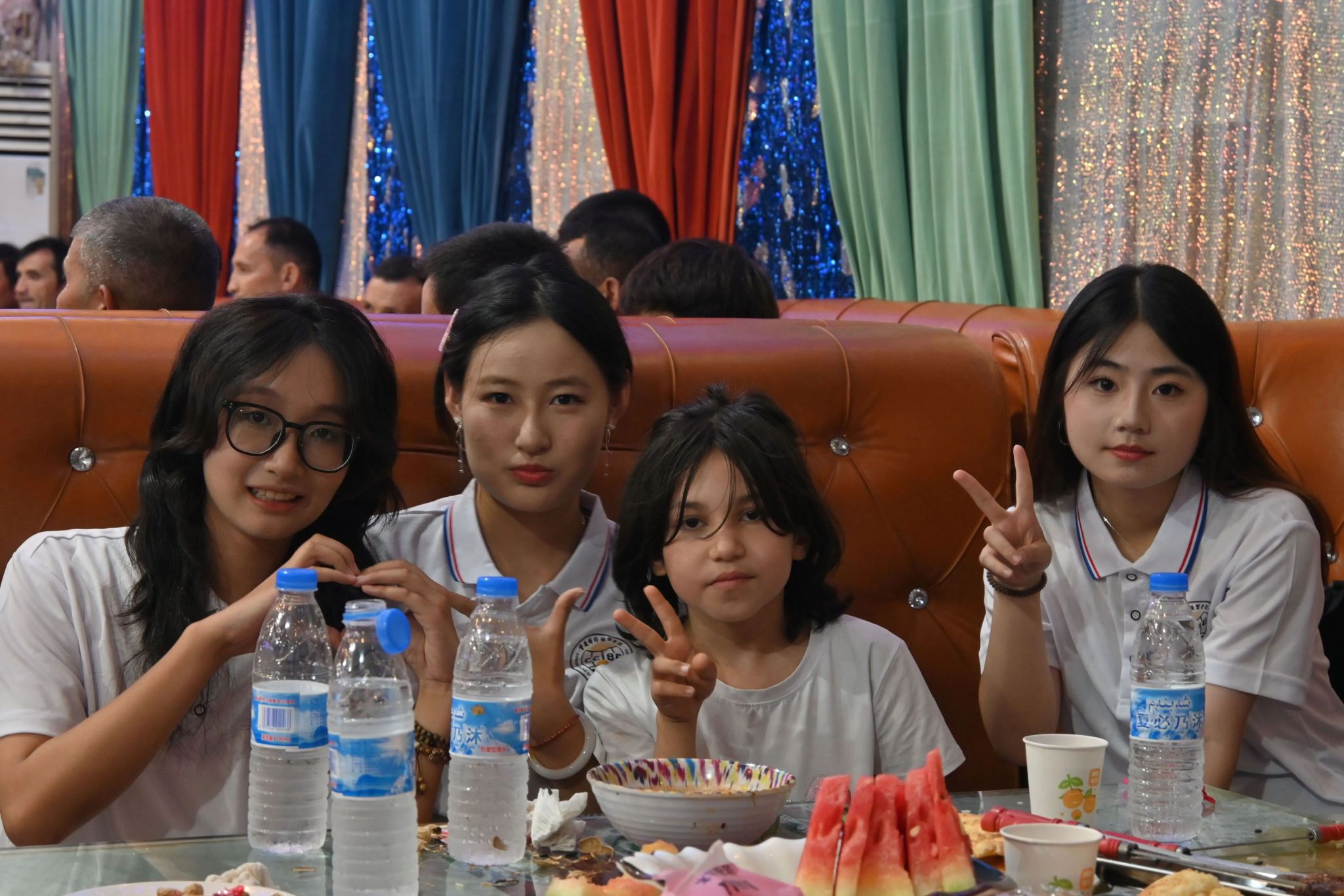 宴席间,这些活泼的孩子们以及热情的乡亲们主动与团队成员交流聊天,分享生活的趣事和当地的风俗。大家一同品尝了香气扑鼻的手抓饭、金黄酥脆的烤包子等特色美食。婚礼中的一个重要环节尤其令人印象深刻:主人家为感谢宾客的参与,特别是对投入舞蹈的客人,逐一献上了象征吉祥、美好祝福的艾德莱斯绸。