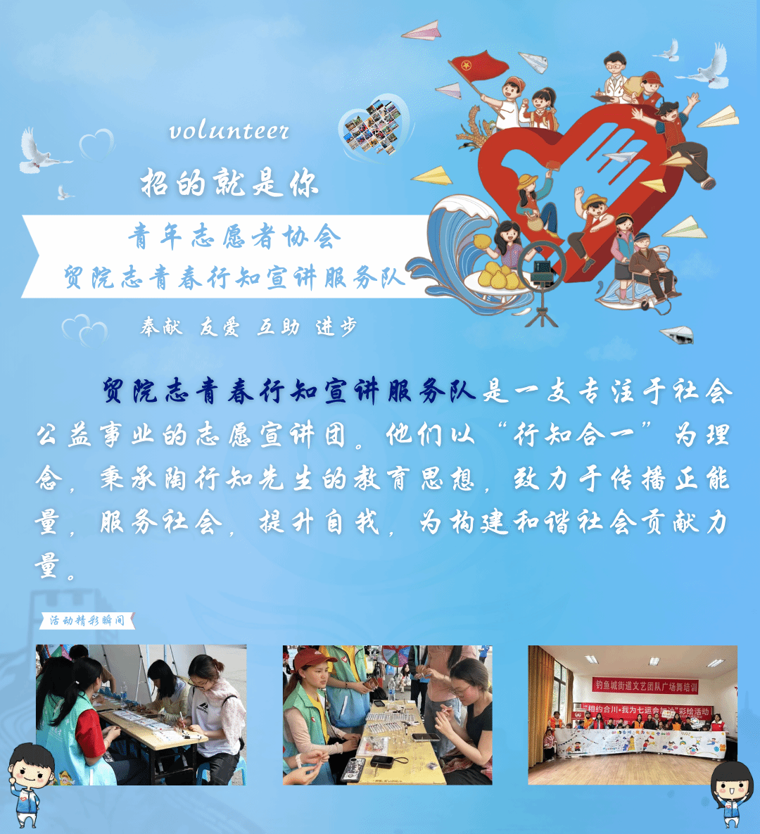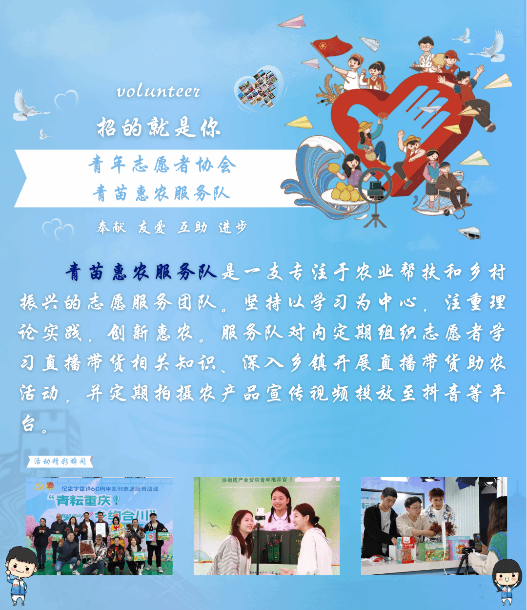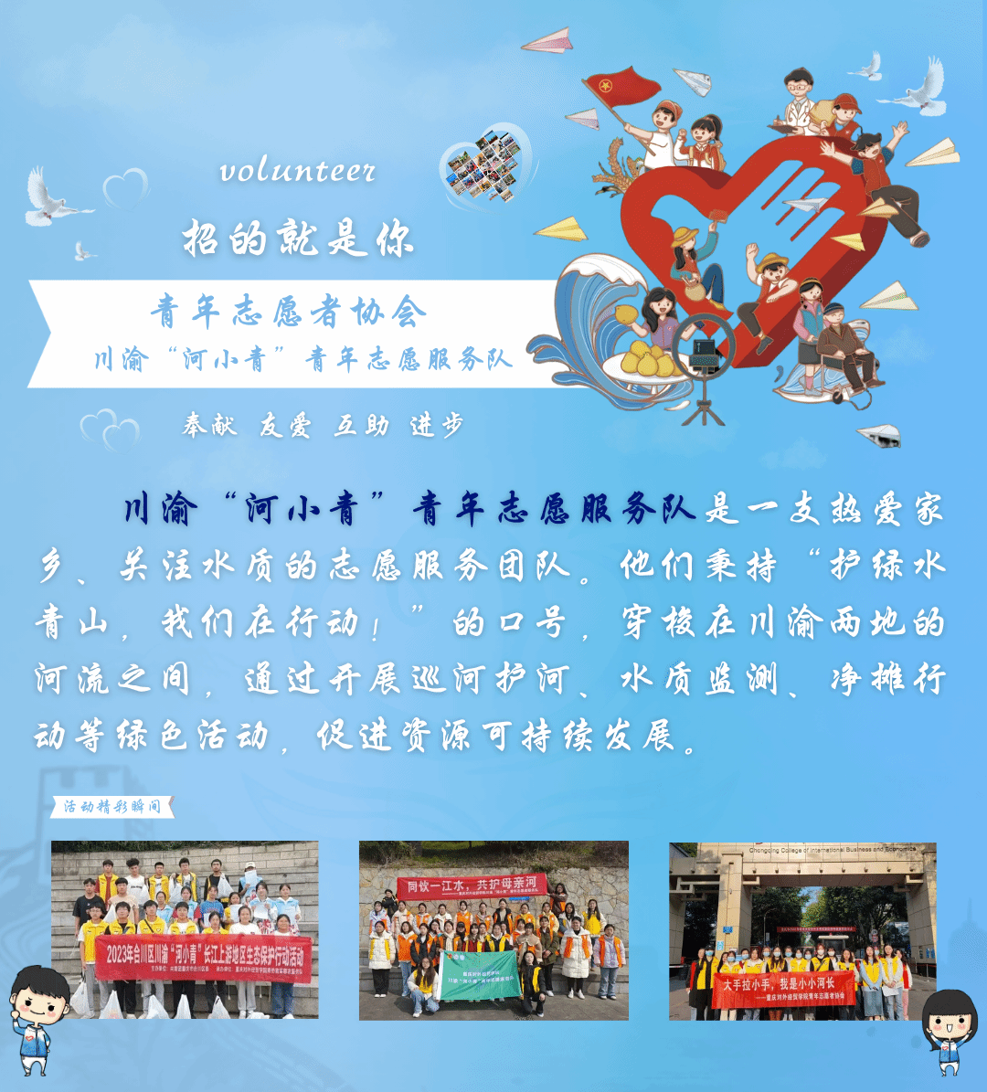 11 支专项服务队为:爱心家教服务队、赛事服务队、携梦暖乡·共筑夕阳服务队、青苗惠农服务队、反诈安全服务队、青少年活动中心服务队、青春倡廉服务队、川渝"河小青"青年志愿服务队、校红十字会服务队、贸院创青春作孚实践服务队、贸院志青春行知宣讲服务队。