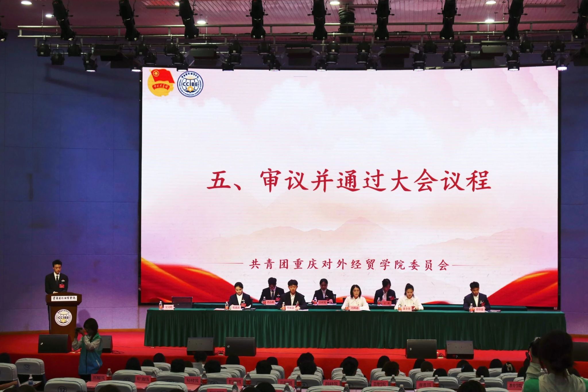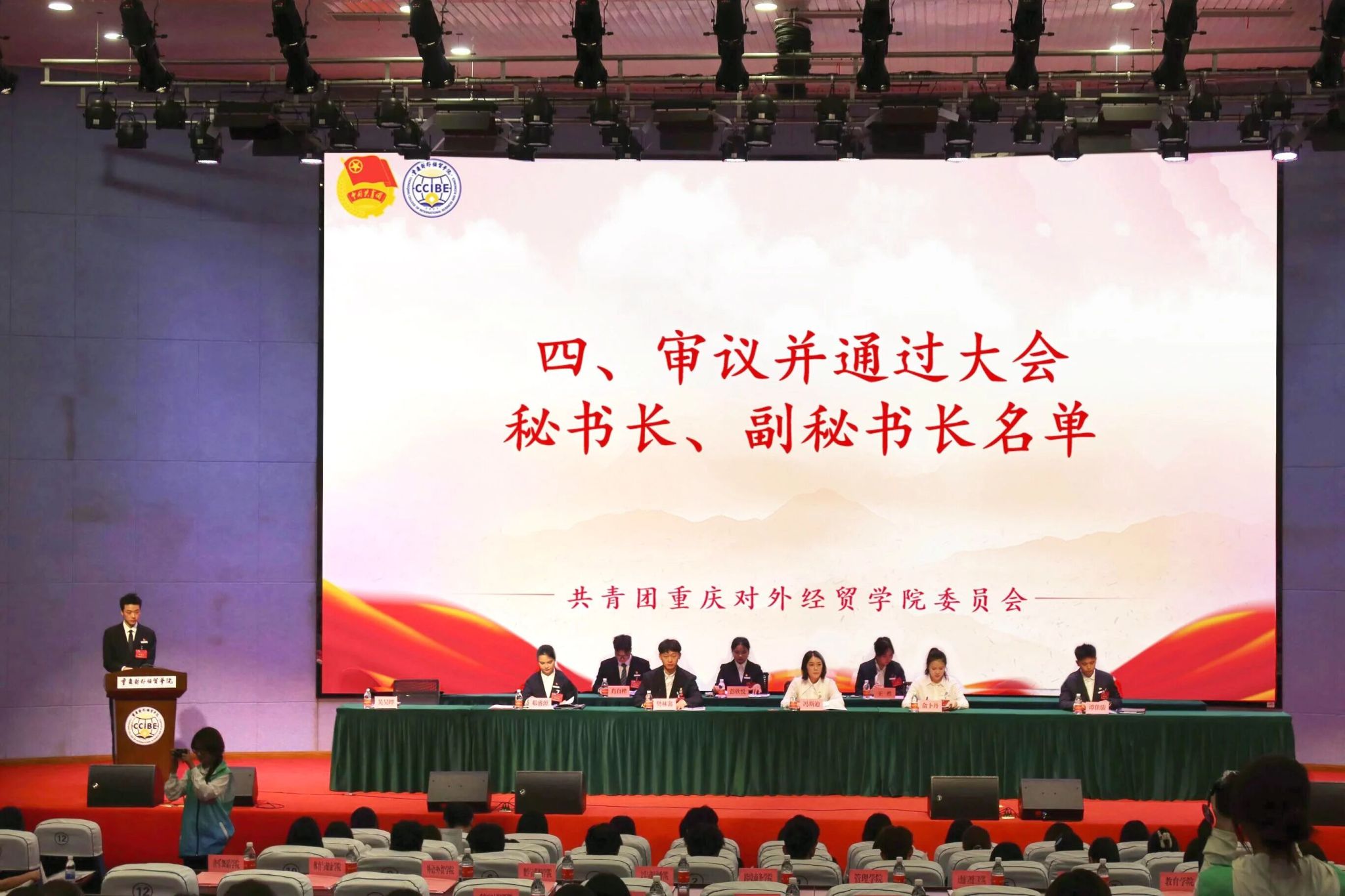 (图为宣读并通过《第四届学生会工作报告》《提案工作报告》《重庆对外经贸学院第五次学生代表大会选举办法(草案)》总监票人、监票人名单、总计票人、计票人名单)