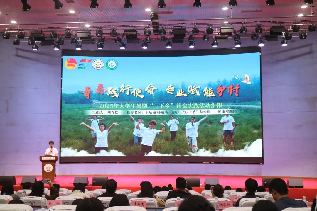 大会第二项议程,由校团委干事封灿老师作2025年暑期社会实践总结报告。她系统回顾了本次暑期社会实践工作取得的丰硕成果,同学们在实践中“培”乡土情怀之元,“致”服务创新之新,以专业所长在多领域深耕,让青春在基层绽放绚丽之花。