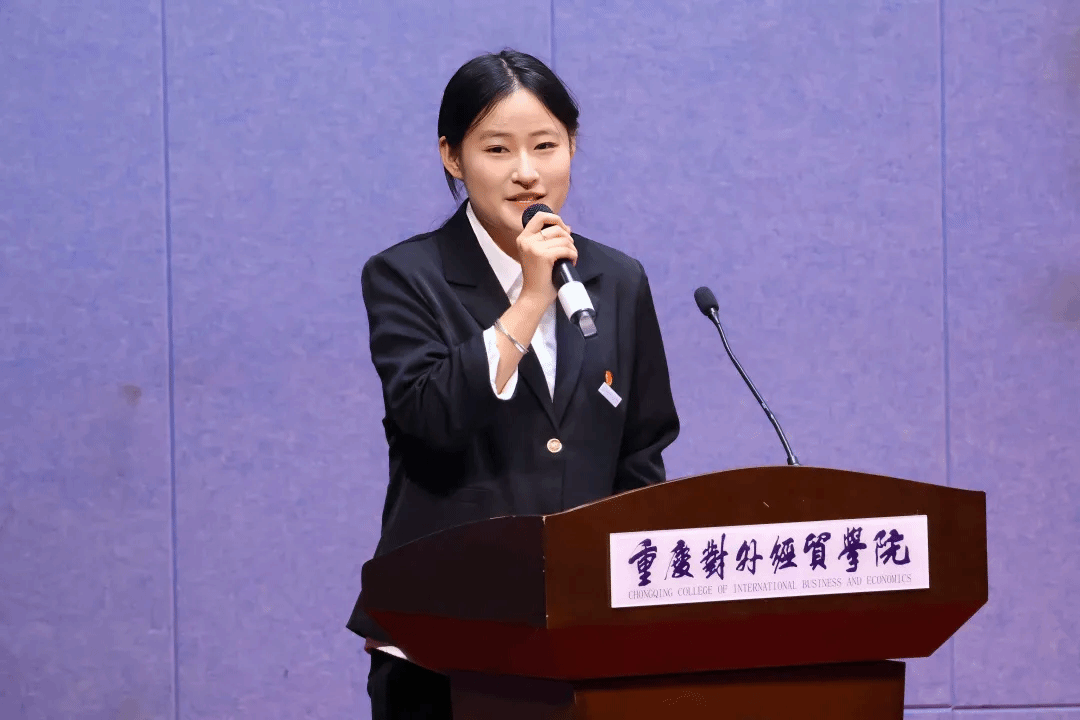 (图为学生兼职团委副书记胡巧琳发言)