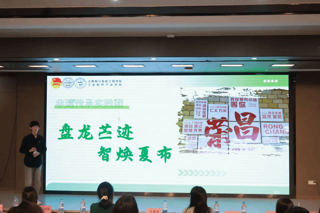 大会进行第二项,三下乡答辩环节。各个团队介绍项目主要工作任务、特色等内容,评委老师现场提问进行答辩。