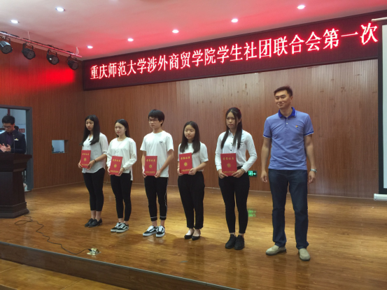学生社团联合会第一次工作大会,团委蒲承玺副书记(右一)为星级社团办法证书