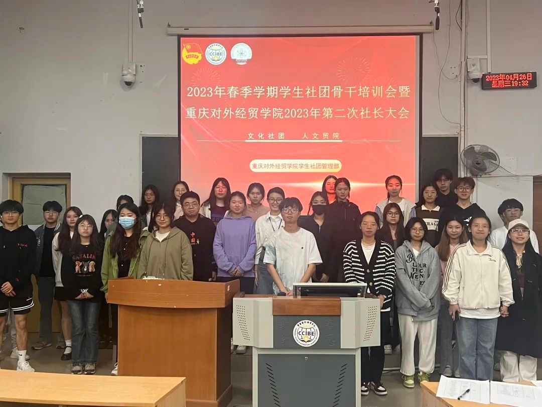 为深学笃用习近平新时代中国特色社会主义思想,深入贯彻落实党的二十大精神,不断加强学生社团建设管理,提升我校学生社团骨干的理论素养、研究能力和实践水平,4月26日,重庆对外经贸学院学生社团管理部在合川A校区A2101教室召开2023年春季学期学生社团骨干培训会暨重庆对外经贸学院2023年第二次社长大会,参与交流会的有我校73个学生社团社长,各二级学院团总支社团部工作人员及学生社团管理部各职能部主要工作人员。