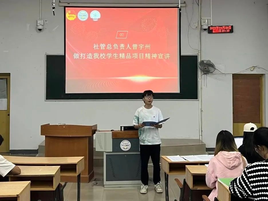 学生社团管理部总负责人曾宇州做打造我校学生精品项目精神宣讲,介绍了我校当前学生社团改革建设成果,鼓励学生社团申报精品学生社团项目,强调了学生社团的“组织育人”功能和加强学生社团建设管理工作,强化思想引领,健全制度体系,加强队伍建设的重要性,为我校参加2023年“全国高校活力社团风采展示”评选打下基础。