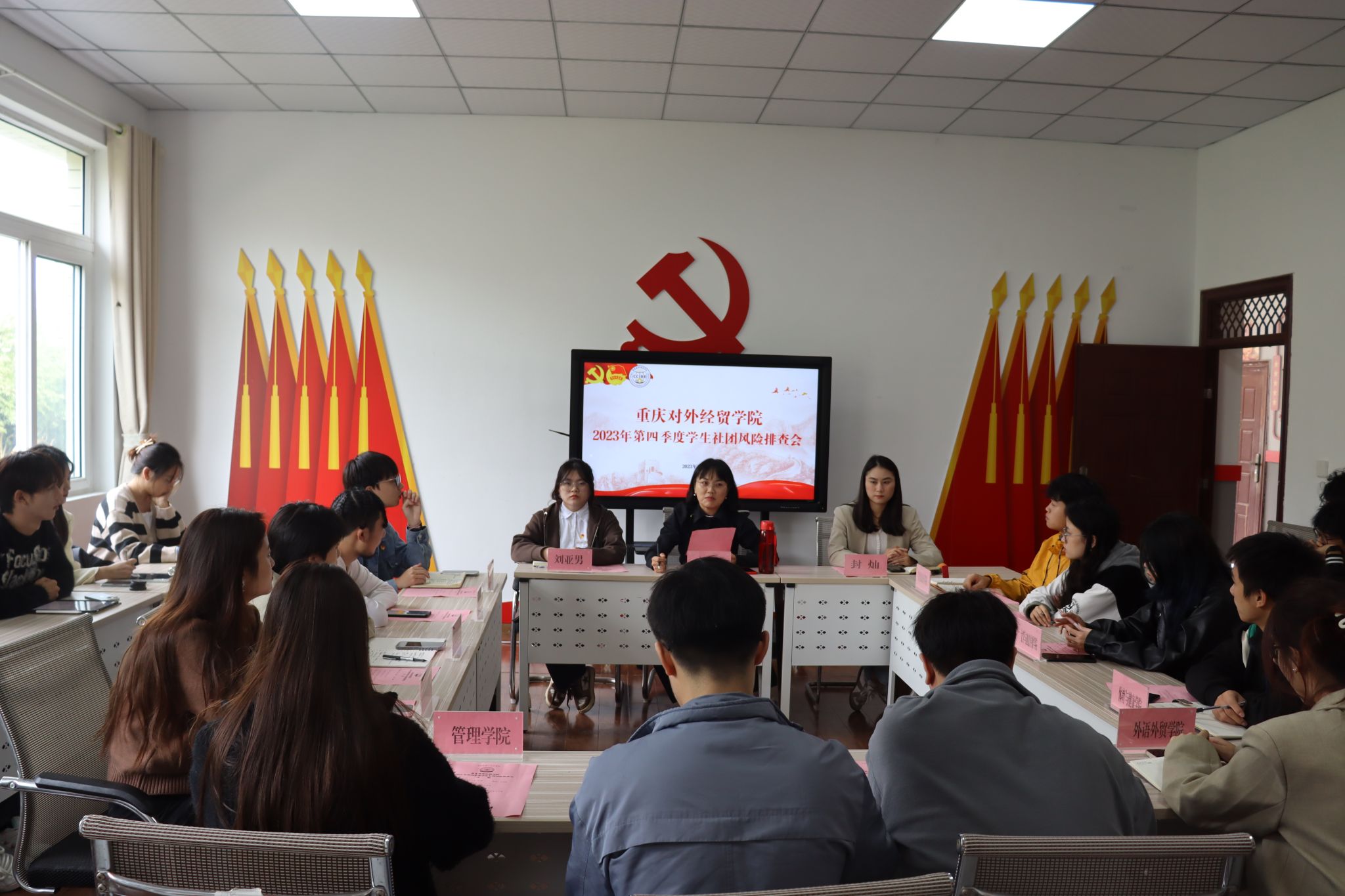 为进一步深化思想认识,提高政治站位,做好学校学生社团意识形态工作,保障学生社团长久蓬勃发展。2023年11月7日12:50,共青团重庆对外经贸学院委员会在合川A校区A2404召开了重庆对外经贸学院2023年第四季度学生社团风险排查会。团委书记史丽涛出席会议并讲话,团委干事封灿、学生兼职团委副书记刘亚男、学生社团管理部负责人、各二级学院学生兼职团总支副书记及团总支社团部负责人参加风险排查会。本次会议由学生社团管理部总负责人曾宇州主持。