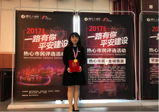 魏涵睿,我校青年志愿者协会安全服务队队长,系外国语学院大三学生。自2015年9月以来,魏涵睿组织带领安全服务队志愿者利用课余时间,走进校园、深入社区,积极协助警方开展反恐安全、防范诈骗、交通文明、禁毒、消防等知识的宣传讲解和治安巡逻活动。这支安全服务队成立于2015年5月,是我校青年志愿者协会与合川区公安局团委联合成立的一支专项志愿服务队伍,是警校合作的连接“纽带”,是安全防范宣传进校园的宣传“阵地”,是校园平安课堂的宣传“助手”。安全服务队目前已拥有213名志愿者,志愿者朝气蓬勃、热爱公益、乐于奉献,积极协助合川区公安局为辖区各大中小学学生和群众提供最有效的防范知识。截至目前,魏涵睿带队协助警方开展各类安全防范宣传活动52场次,发放各类宣传资料3万余份;开展治安巡逻活动百余次,服务群众近万人。