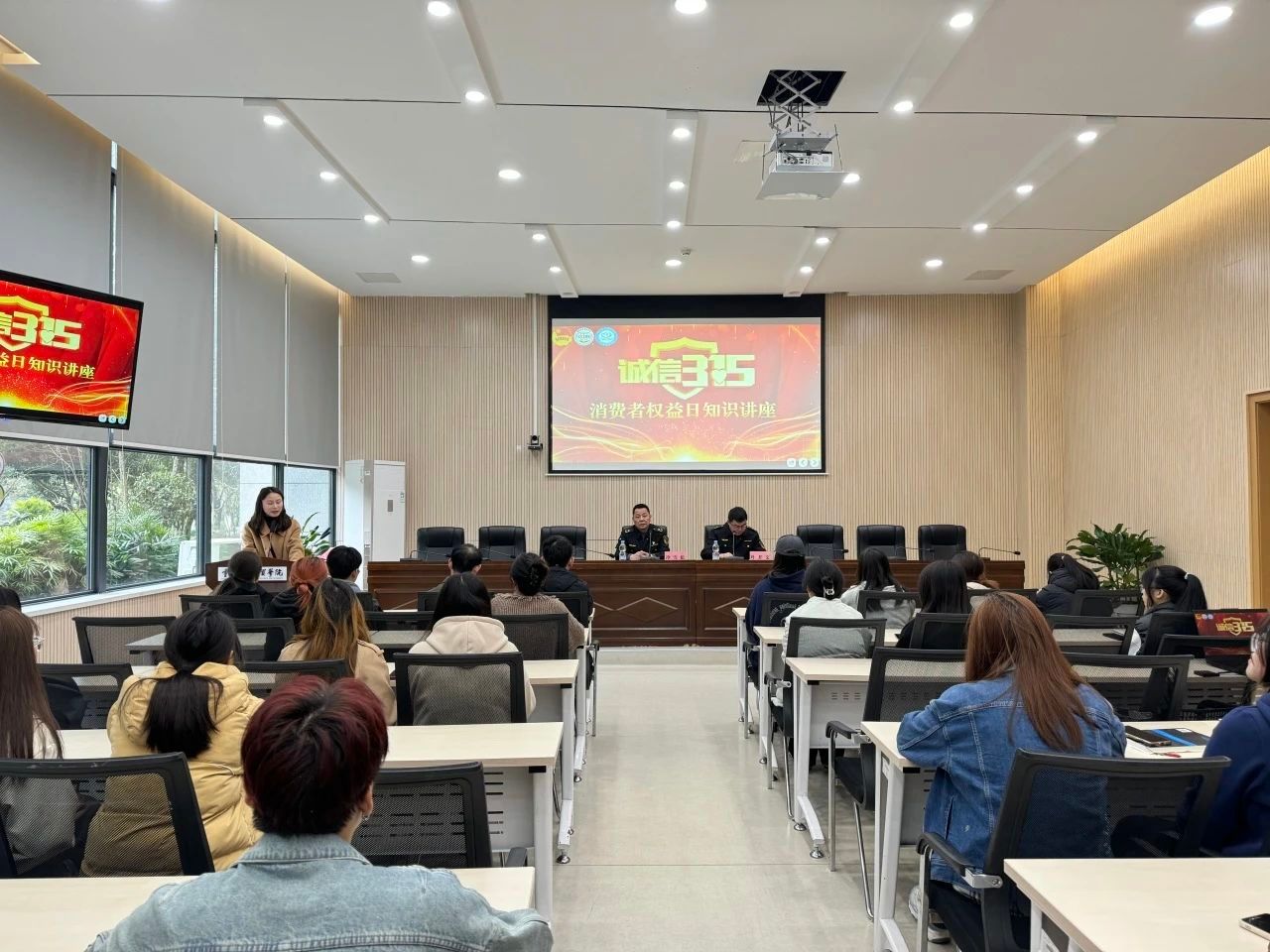 为切实做好消费者权益保护教育,着力增强贸院学子的消费风险防范意识,2024年3月15日,重庆对外经贸学院团委邀请到了合阳城街道市场监督管理所副所长冷雪松和市场监管执法人员叶开文面对全校学生在合川A校区9106开展了“315消费者权益保护宣传”主题讲座活动。