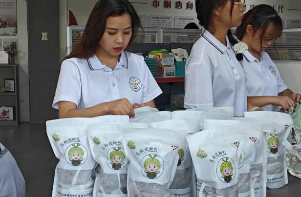 (图为促进团指导老师与成员对花椒包进行装袋)