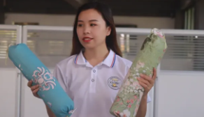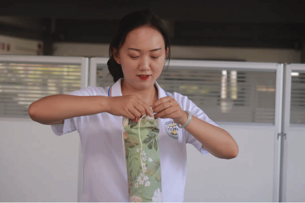 另一部分成员完成绳子与枕套松紧袋组装,将缝制好的枕头内胆平整放入枕套;后续人员负责花椒籽的装填及封口操作,花椒枕头制作完毕。
