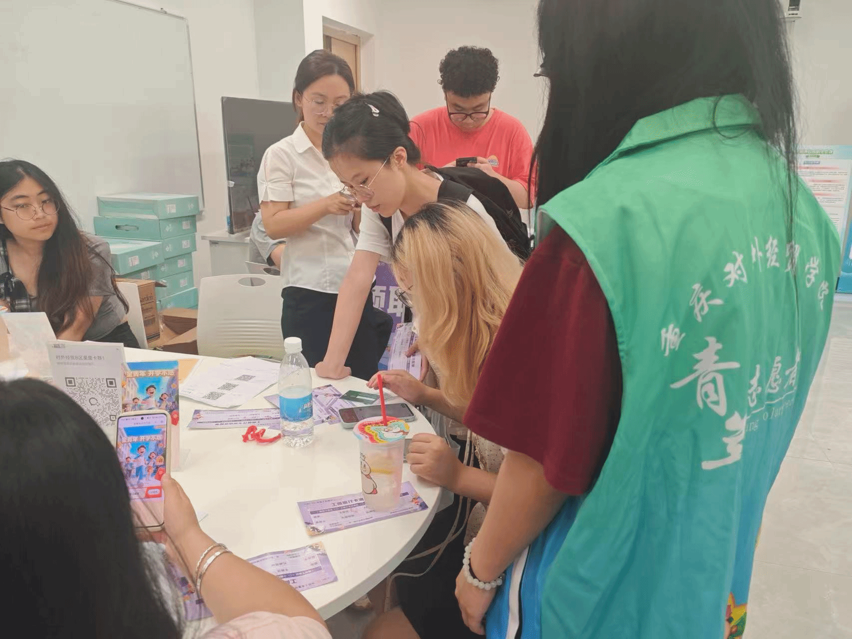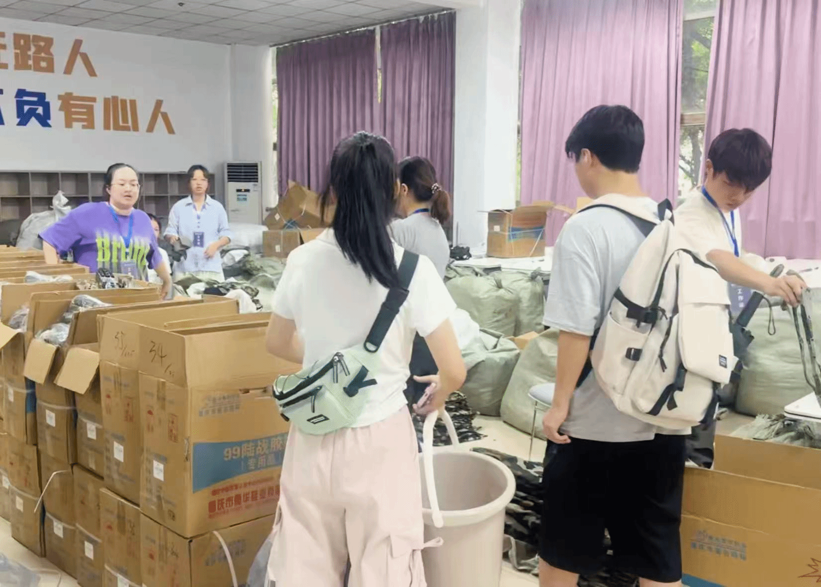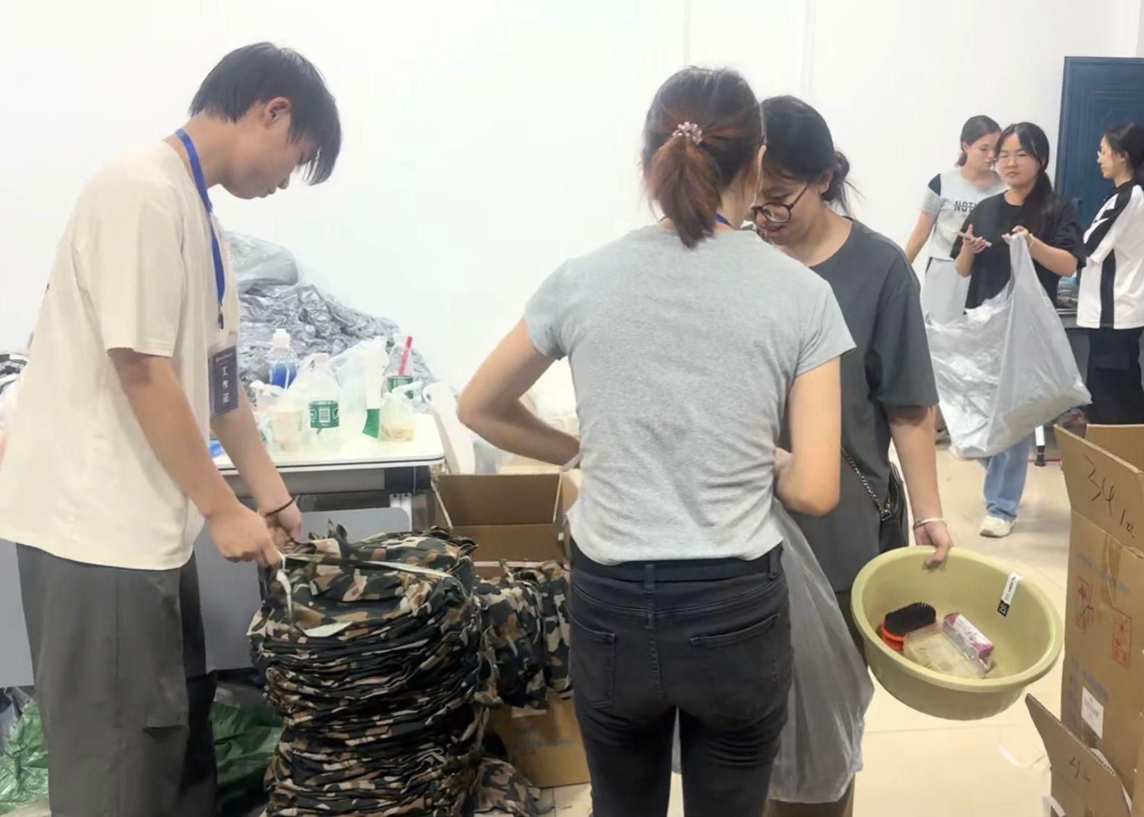 贸院内的核心服务点同样暖意满满,财务处的志愿者们全程答疑,为大家理清流程,细致引导新生办理缴费与入学手续;在军训物资发放点,志愿者们认真核对每一份“军训能量包”,高效有序地将物资精准送到新生手中,让入学准备的每一步都便捷又安心。