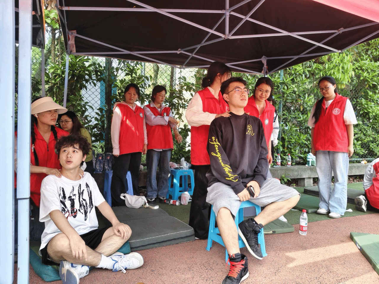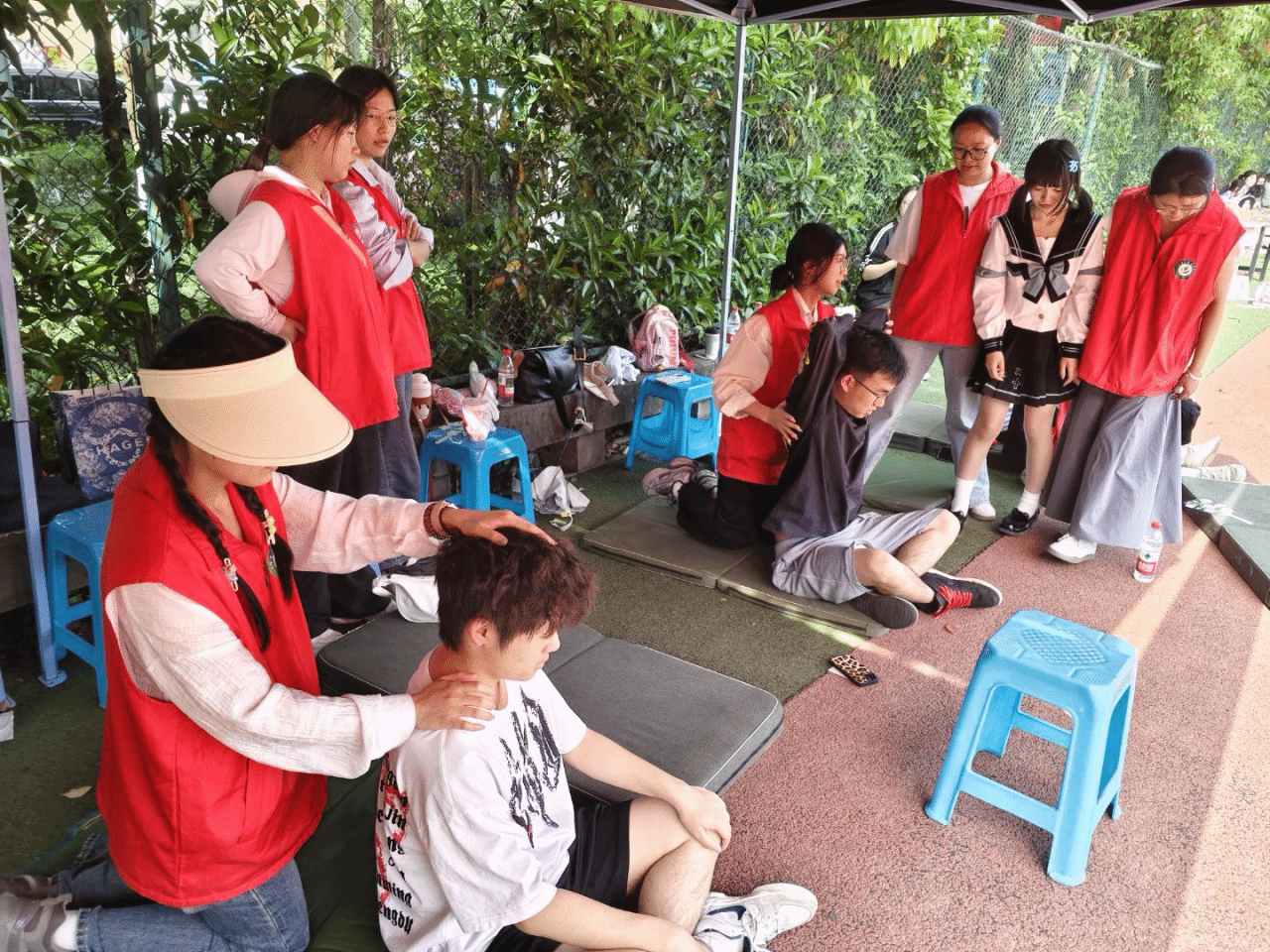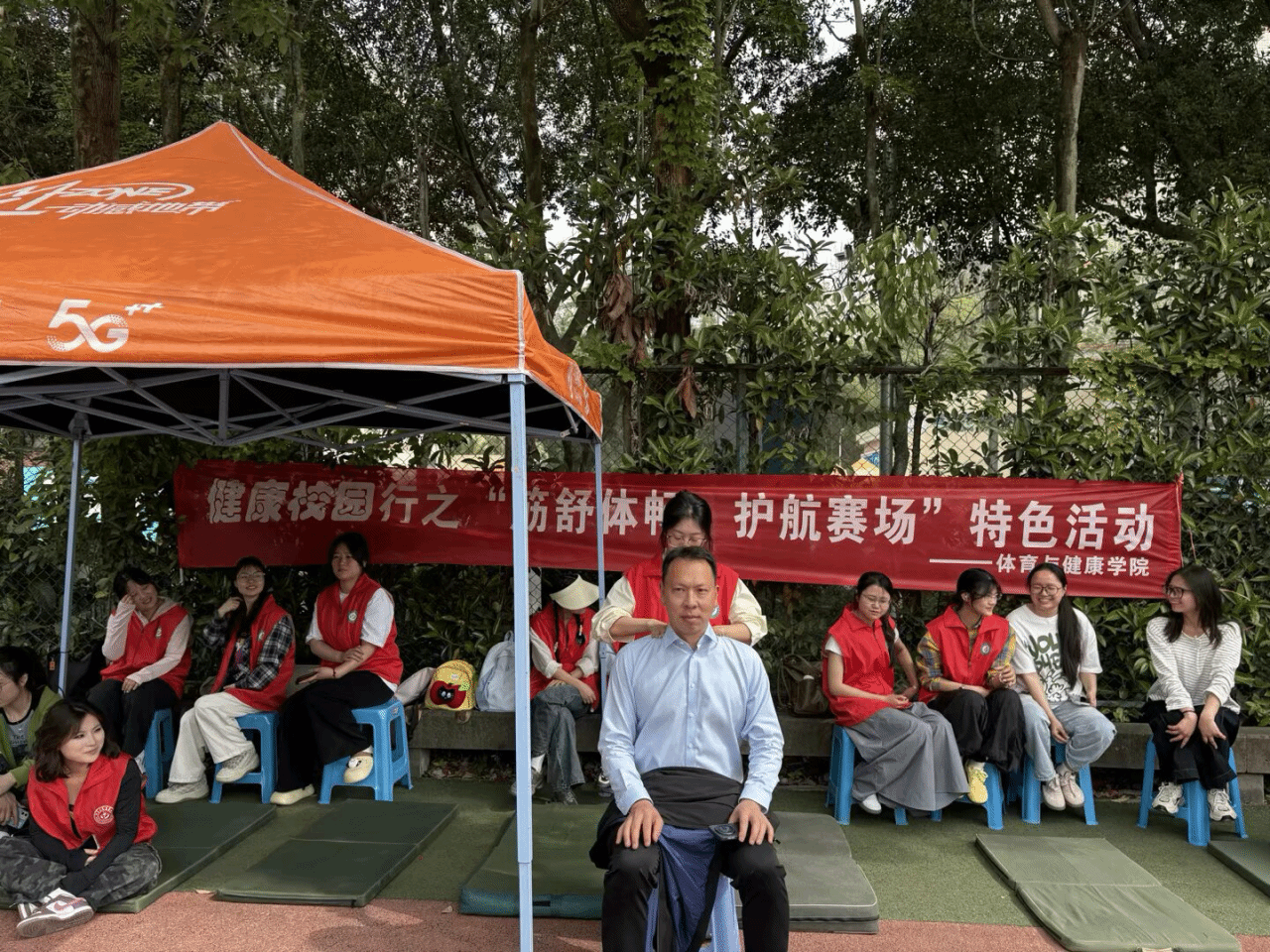 由校团委与体育与健康学院联合开展的健康校园行活动也在顺利进行中,志愿者们为赛后运动员们贴心地按摩拉伸。