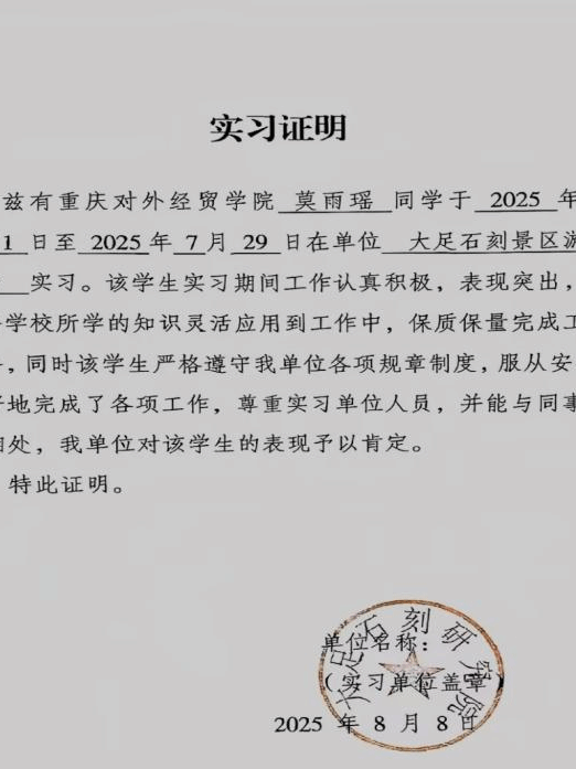 作为一名2024级汉语言文学专业的贸院大学生,在大足石刻实习的日子,是我目前大学生活中一段充满感动与成长的旅程。我选择在千年石刻文化中开启职业生涯。在游客中心,我每天面对形形色色的游客,解答票务、指引路线,将课堂上的沟通理论转化为平实的语言与耐心的微笑。这份工作让我明白,服务不仅是流程,更是人与人之间真诚的连接。
