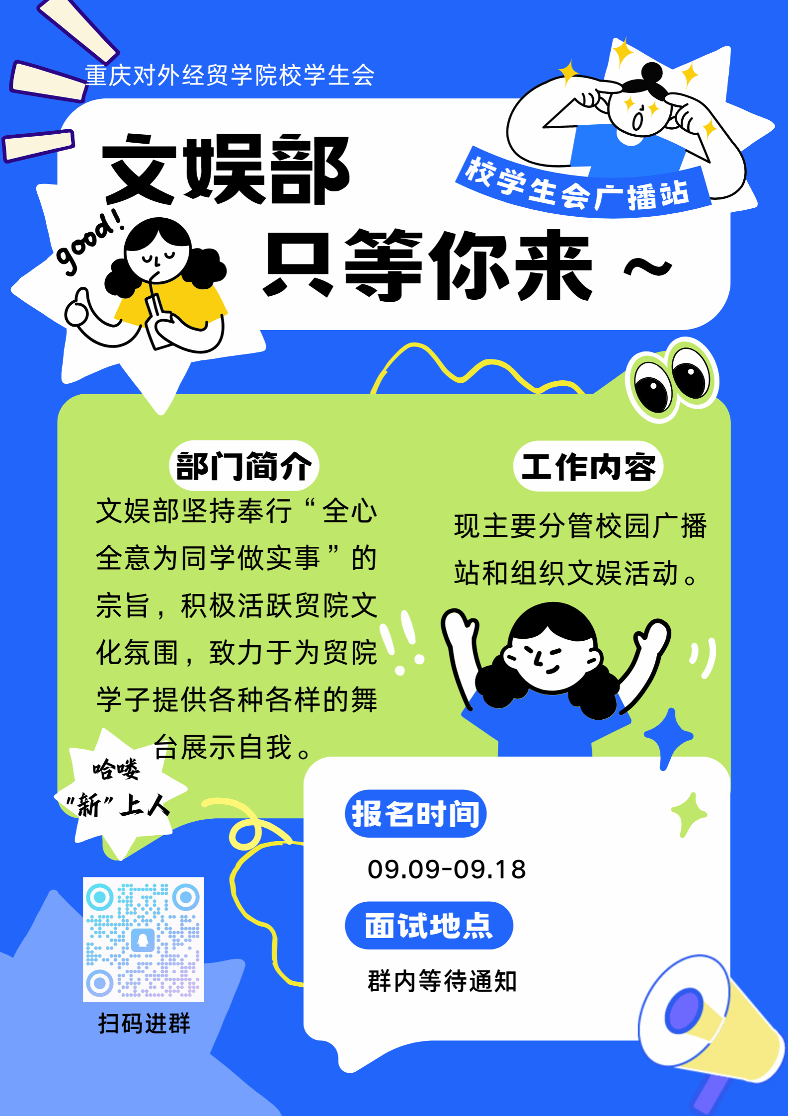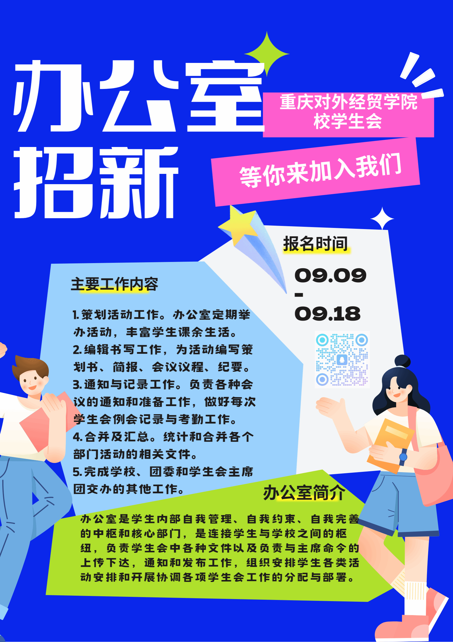 秋风送爽,丹桂飘香,在这个收获的季节里,重庆对外经贸学生会迎来了一年一度的招新时刻!我们始终坚持以服务同学为宗旨,用心倾听大家的声音,用行动回应大家的需求,努力为全校同学做实事、解难事、办好事。我们诚挚邀请怀揣梦想、渴望绽放的你,加入我们这个温暖而充满活力的大家庭。