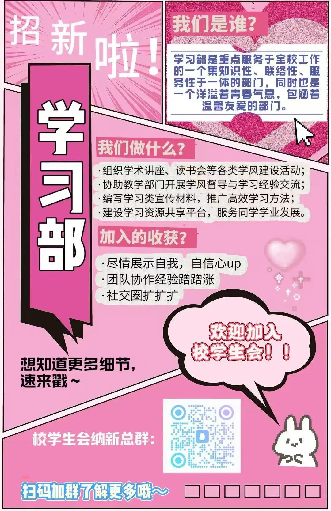或许你还在犹豫:担心自己经验不足,害怕平衡不好学业与工作,或是不确定这里是否能找到归属感。但请相信,没有人生来就擅长所有事,学生会最珍贵的,正是给每一个心怀热忱的人提供试错、成长的空间。在这里,你可以把天马行空的创意变成落地的校园活动,能在和伙伴协作中收获同频的友谊,更能在为同学服务的过程里,找到自己的价值坐标。