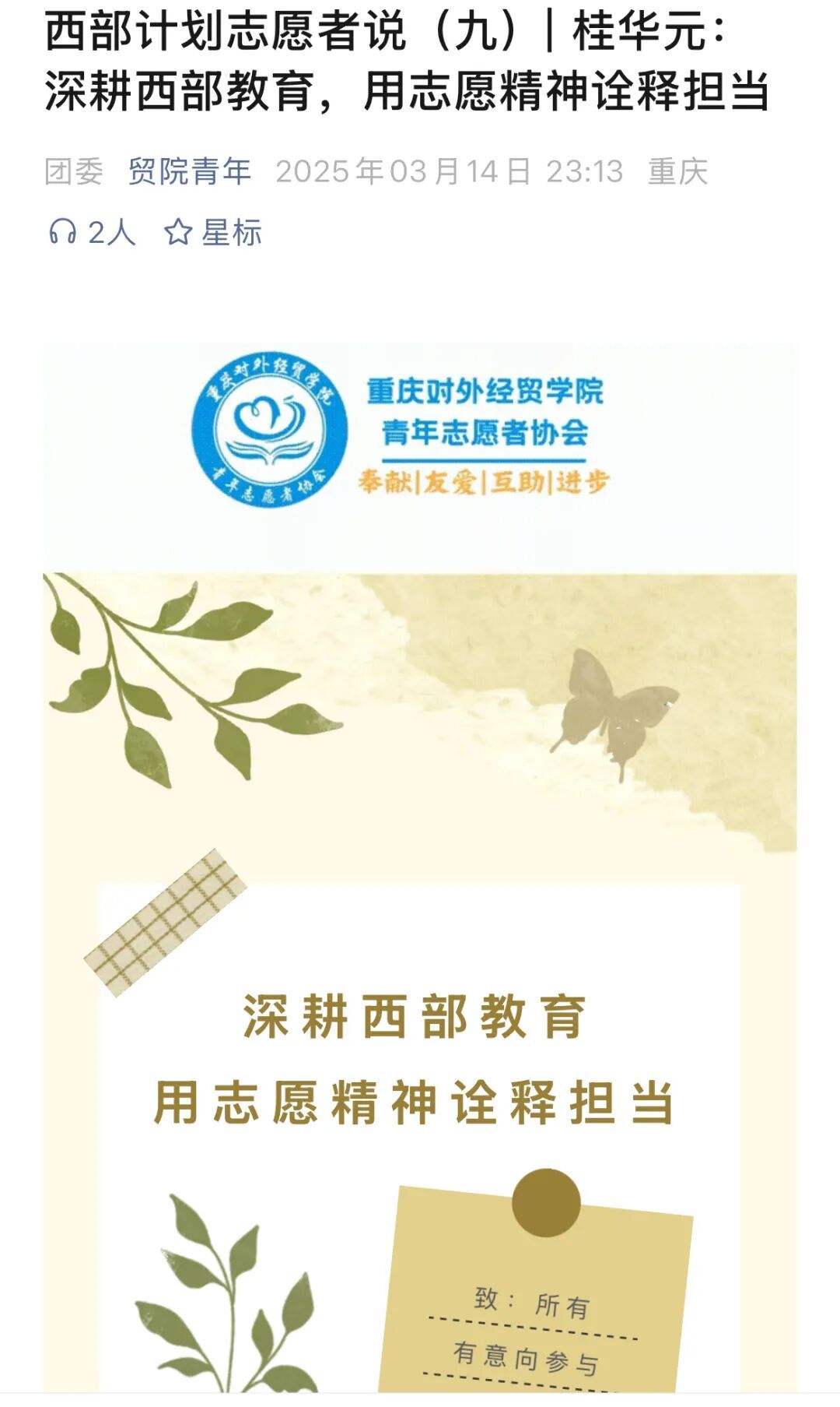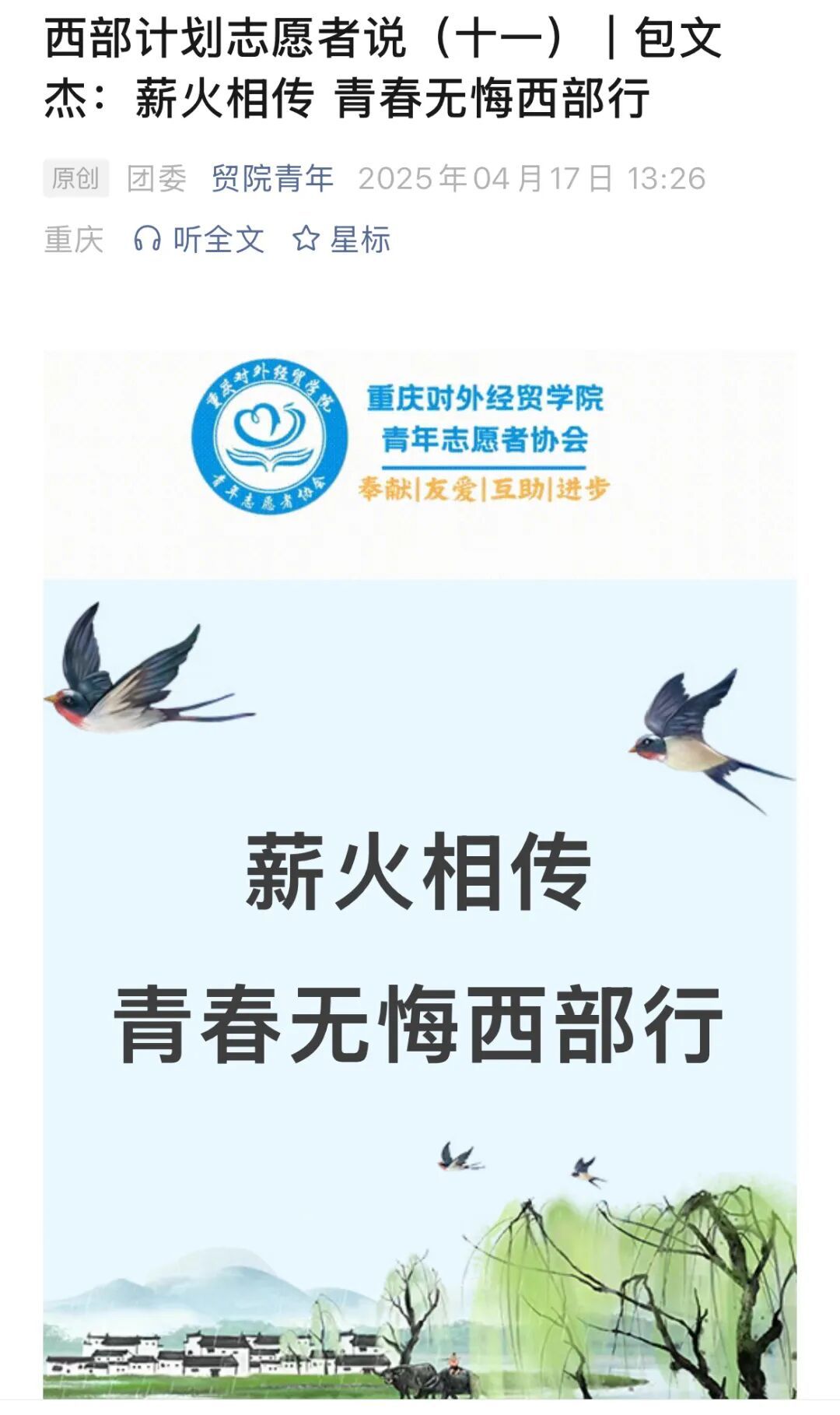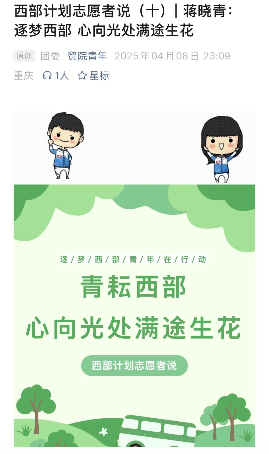 依托学校官方公众号持续推出多期西部计划专题推文,通过挖掘并展示往届贸院西部计划志愿者的服务经历与成长故事,生动呈现西部计划的实践价值与发展机遇,为后续选拔工作有序推进奠定坚实基础,也进一步激发了学生参与西部建设的热情。
