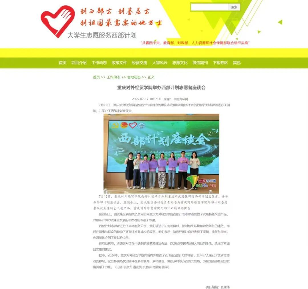 2025年7月15日,由共青团重庆市武隆区委、重庆对外经贸学院西部计划项目办主办,重庆对外经贸学院 “青融武隆行,执笔青春践初心” 社会服务践行团承办的西部计划座谈会在武隆区文旅青创中心成功举办。此次座谈会既是学校深化西部计划育人工作、为学子搭建实践交流桥梁的重要举措,也进一步彰显了学校引导青年服务国家战略、培育时代担当的育人导向,其工作成效与活动价值还得到全国大学生志愿服务西部计划官方平台的关注与报道。