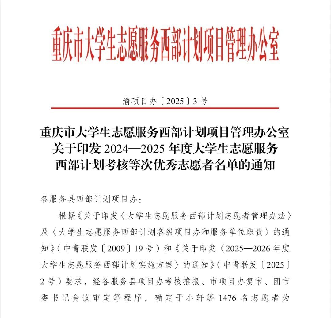 【本网讯】近日,重庆市大学生志愿服务西部计划项目管理办公室下发了《关于印发重庆市2024—2025 年度大学生志愿服务西部计划考核等次优秀志愿者名单的通知》(渝项目办〔2025〕3号),我校选派的61名西部计划志愿者荣获全国、全市年度考核优秀等次!其中,41名西部计划志愿者荣获全国考核优秀等次!20名西部计划志愿者荣获市级考核优秀等次!